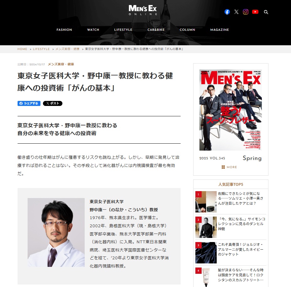 掲載Webサイト紹介 なんでスポーツ紙? 野中先生の記事をネットで発見しました!(「穿孔率」をしっかりと聞いてリスク回避を/東京女子医科大学病院消化器内視鏡科・野中康一教授(日刊スポーツ) – Yahoo!ニュース) 202405/12